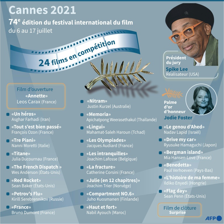 L'affiche avec Spike Lee, le président du jury, orne le Palais: tout est prêt ou presque lundi pour le 74e festival de Cannes, une édition pour conjurer le Covid-19 qui avait privé le cinéma mondial de son rendez-vous sur la Croisette en 2020.