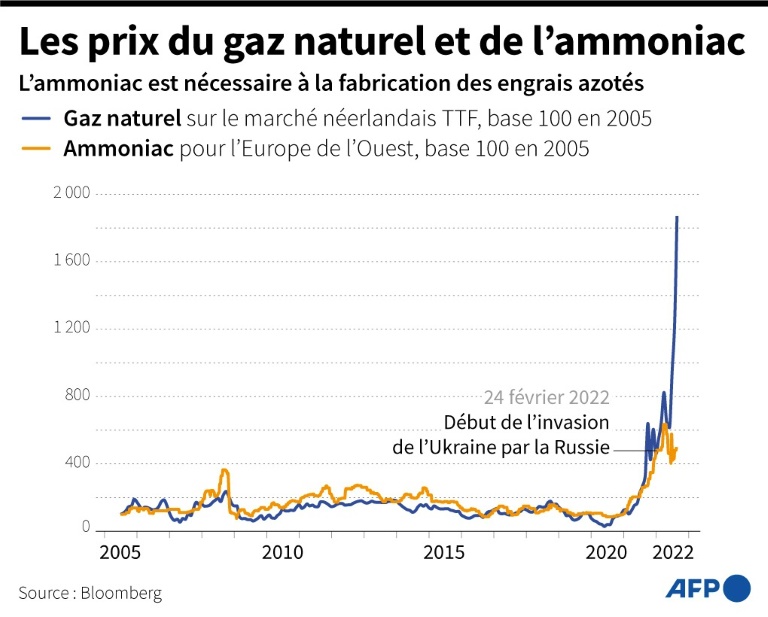 Jamais les engrais de synthèse dits NPK - fabriqués à partir d'azote, de phosphore ou de potasse - n'ont été aussi chers: les prix internationaux ont triplé entre début 2021 et mi-2022.