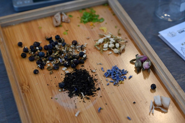 Le gin a traditionnellement une base de baies de genévrier mais quantité d'autres plantes peuvent y être ajoutées pour créer une grande variété d'arômes. Tonya Shaw, 45 ans, prend un morceau de galanga, un rhizome à la saveur citronnée, le renifle et le découpe avant de le poser dans un plateau qui contient aussi de la lavande et des boutons de rose. "J'aime bien avoir un petit goût d'agrume et une touche florale, donc je me suis inspirée, de l'Earl grey, ma saveur préférée".