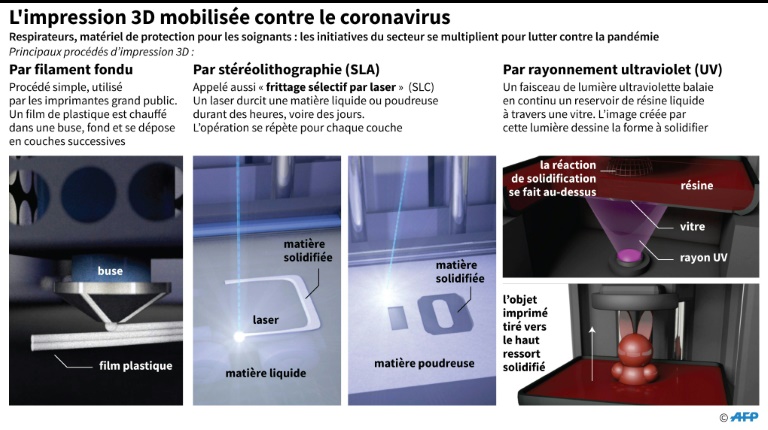 Des "bricoleurs" produisant des visières dans leur salon à la start-up de pointe fabriquant des pièces sur mesure à l'hôpital, les initiatives d'impression 3D foisonnent face au Covid-19, mais les degrés de sophistication sont variables et la coordination compliquée.