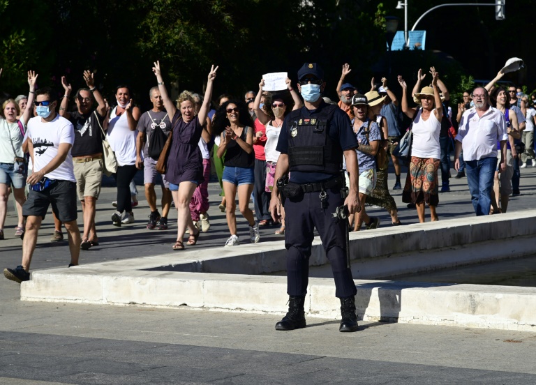 Pilar Martin, une femme au foyer de 58 ans originaire de Saragosse (nord-est) a déclaré être venue manifester à Madrid parce qu'elle pensait que les gouvernements du monde entier exagèrent les chiffres des personnes infectées afin de restreindre les libertés publiques. "Ils nous forcent à porter les masques, ils veulent nous confiner. Ce ne sont que des mensonges", a-t-elle déclaré à l'AFP.