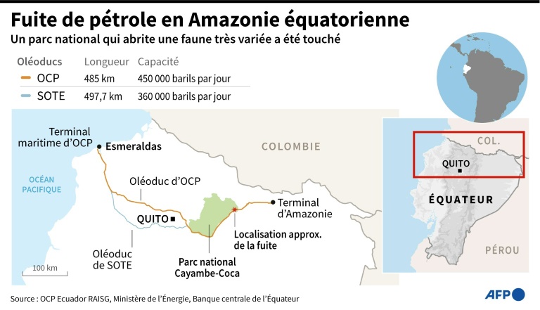 Près de 6.300 barils de pétrole, soit plus d'un million de litres, se sont déversés plus en amont dans une réserve environnementale, à une centaine de kilomètres à l'est de la capitale Quito après la rupture d'un oléoduc en fin de semaine dernière.