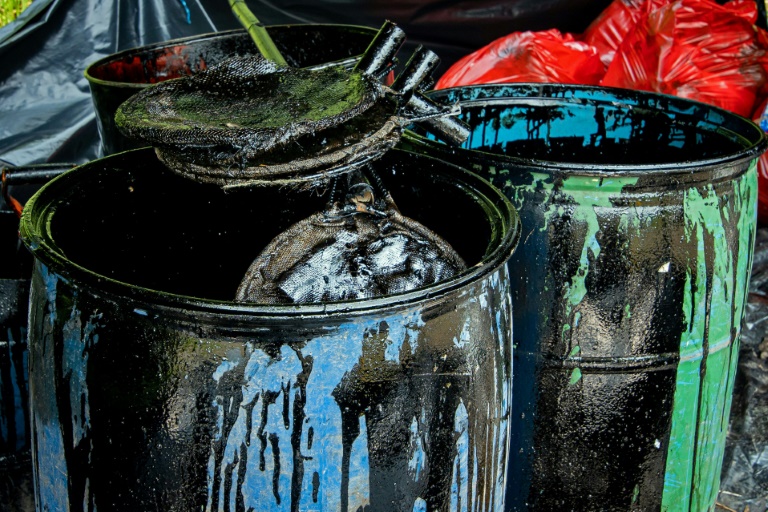 Les ouvriers passent d'une rive à l'autre en bateau transportant des sacs de sable souillés de brut, qu'ils empilent ça et là en attendant de les évacuer. Ironie de la nature, des papillons tournent autour de ces déchets.
