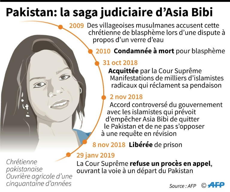 Mardi, la France a réitéré son offre d'"accueillir Asia Bibi et sa famille si elles le souhaitent". On prête à la chrétienne l'intention de demander l'asile dans un pays européen ou au Canada où ses enfants se trouveraient déjà, selon plusieurs sources diplomatiques à Islamabad, ce qu'Ottawa n'a pas confirmé. Le TLP, qui a fait du blasphème son unique combat, apparaît affaibli après l'arrestation à l'automne de son chef Khadim Hussain Rizvi et de centaines de ses partisans. Mardi soir, ils étaient peu nombreux à participer à de premières manifestations. Le blasphème est un sujet extrêmement sensible au Pakistan, où des accusations suffisent à provoquer des lynchages meurtriers.