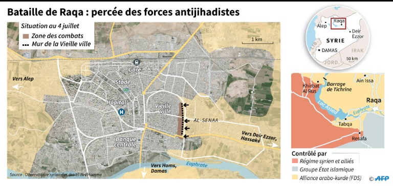 Les Forces démocratiques syriennes (FDS) --une alliance de combattants kurdes et arabes-- ont ouvert mardi des brÚches dans le mur qui entoure la vieille ville de Raqa, dernier grand fief urbain de l'organisation jihadiste en Syrie.