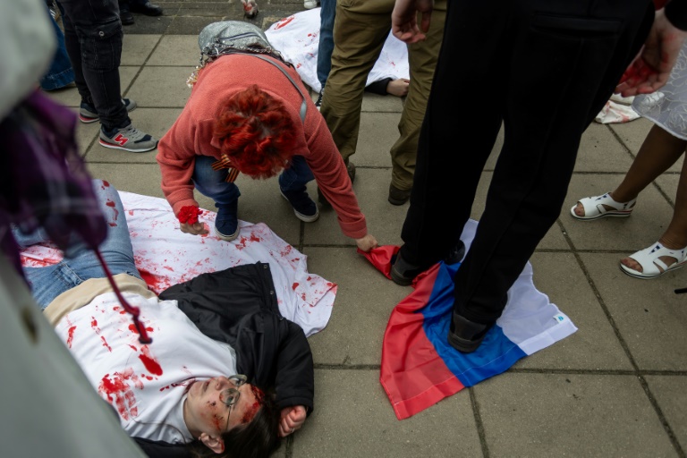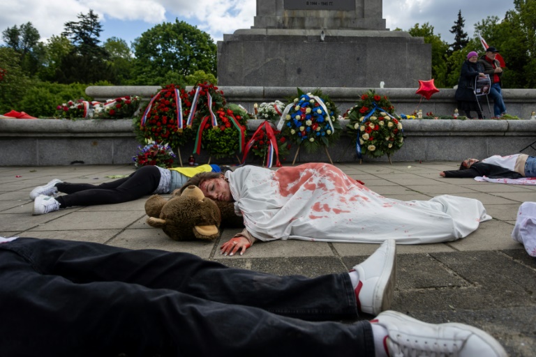Des manifestants pro-ukrainiens simulant la mort ont protesté allongés par terre devant un mémorial soviétique à Varsovie, où l'ambassadeur russe est venu déposer une couronne vendredi, le jour où la Russie célèbre la Victoire de la Seconde Guerre mondiale.