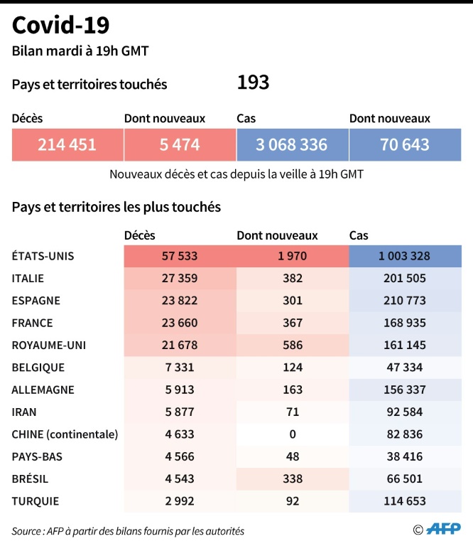Au total, plus de trois millions de personnes ont été diagnostiquées dans le monde comme malades du Covid-19 et plus de 215.000 en sont mortes depuis l'apparition de la maladie en Chine en décembre, malgré le confinement de plus de la moitié des habitants de la planÚte. AprÚs les Etats-Unis, les pays les plus touchés sont l'Italie avec 27.359 morts, l'Espagne avec 23.822 morts, la France avec 23.660 morts et le Royaume-Uni avec 21.678 morts, selon un bilan établi par l'AFP mardi à 19h00 GMT à partir de sources officielles.