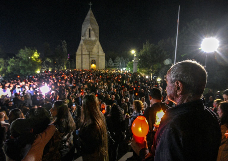 Conduits par l'ancien président Robert Kotcharian, les manifestants ont marché, à la lumière des torches, du centre-ville vers le cimetière militaire d'Erablur à la veille du premier anniversaire du déclenchement, le 27 septembre 2020, de ce nouveau conflit meurtrier.