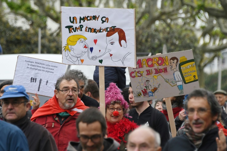 À Toulouse en matinée, quelque 1.500 personnes selon la police et 3.000 selon les organisateurs se sont rassemblées devant le siège du Medef avant de partir en cortège vers le tribunal. La manifestation était aussi ponctuée de slogans mi-revendicatifs mi-moqueurs, "Pour un passage en douceur des promesses imprévues" avec un tube de vaseline dessiné, "un Macron ça Trump énormément" ou encore "Bonne fête au président Méprisant, Arrogant, Carrabistouilleur, Réactionnaire, Orgueilleux, Napoléonien", ou "Paradis pour les uns, pas un radis pour les autres".