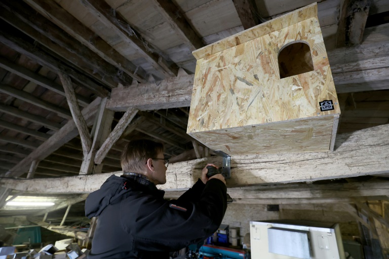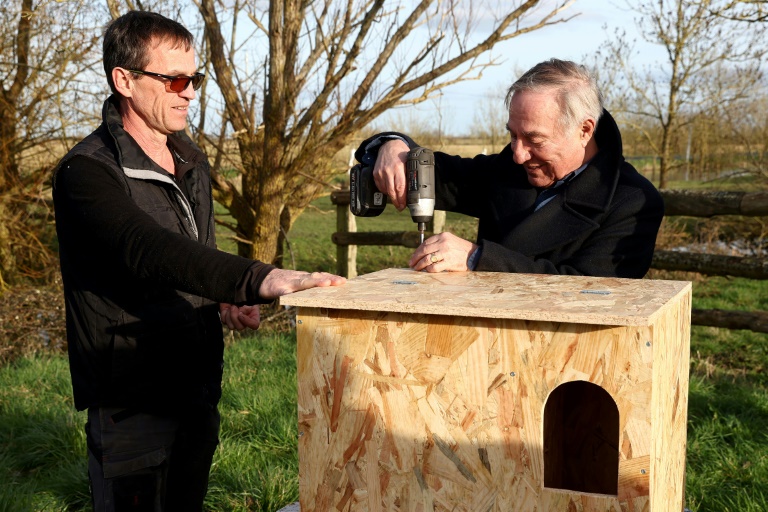 Juché sur son tracteur, Hugues des Touches supervise l'installation d'une petite boite en bois sur la poutre de sa grange: au coeur du Marais poitevin, ce premier nichoir à chouettes effraies financé par le Loto de la biodiversité doit faciliter la reproduction de ce rapace nocturne, en déclin dans les campagnes françaises.
