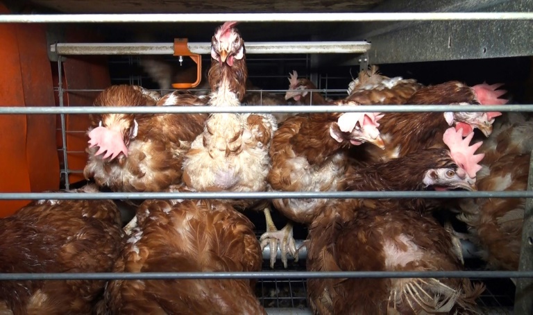 L214 dénonce, dans le communiqué accompagnant la vidéo, "des animaux dans un état déplorable et des conditions sanitaires exécrables", des poules "extrêmement déplumées, des parasites grouillant sur les oeufs, des poules blessées dans un état dramatique, des cadavres dans les cages, bloquant la circulation des oeufs".
