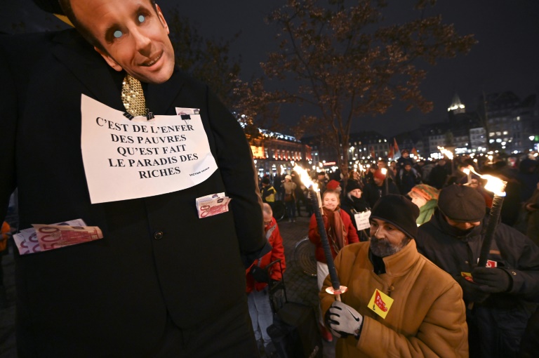 A Strasbourg (800 participants selon la police, 1.200 selon la CGT), des manifestants tenaient une grande banderole sur laquelle était inscrite "Macron, Etat, patrons, battez en retraite", tandis qu'un autre brandissait un pantin en costume noir avec un masque d'Emmanuel Macron et des faux billets sortant des poches et une pancarte autour du cou affirmant "c'est de l'enfer des pauvres qu'est fait le paradis des riches".