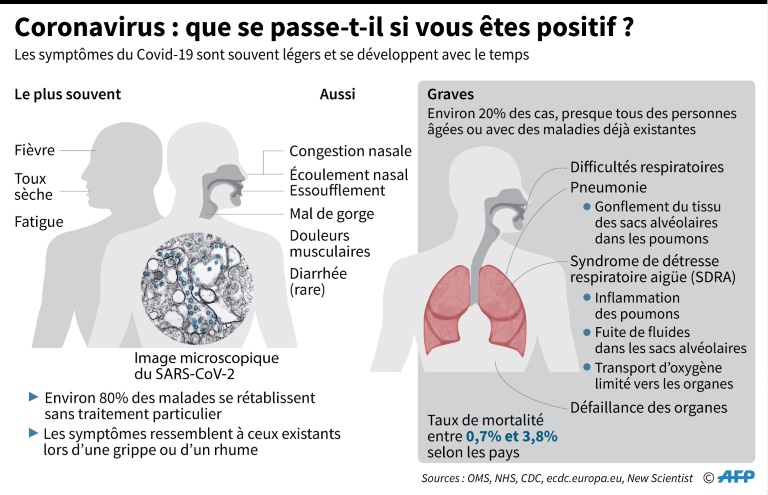 Les symptômes du Covid-19, la plupart du temps bénins, varient d'un patient à l'autre mais semblent bien caractéristiques du nouveau coronavirus que notre système immunitaire ne connaît pas.