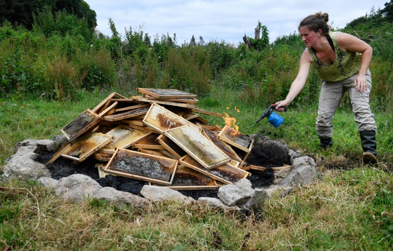 "On a pris la décision de tout cramer sur notre terrain car la déchetterie n'en voulait pas, ça moisissait et des papillons s'installaient avec le risque de contaminer les ruches vivantes", justifie Thomas, ancien urbaniste qui s'inscrit dans une démarche d'agriculture responsable.
