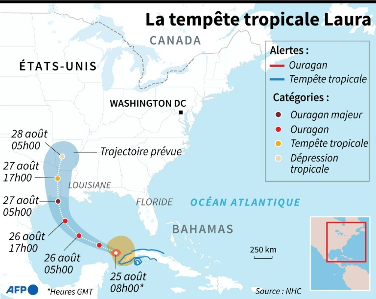 Le NHC, basé à Miami, a mis en garde contre des crues soudaines et des inondations dans des portions du Texas, de la Louisiane et de l'Arkansas. "Nous devons nous préparer à ce que Laura puisse devenir un (ouragan de) catégorie 4", a affirmé le gouverneur du Texas, Greg Abbott.