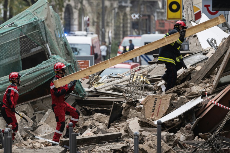 Les pompiers à pied d'oeuvre évoluaient avec précaution samedi après-midi dans les gravats, un mélange poussiéreux de briques et de poutrelles en métal, restes d'un échafaudage sur la façade du bâtiment.