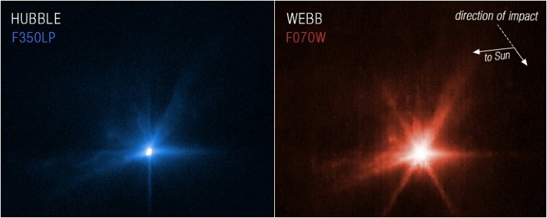 Le télescope James Webb, qui mène ses observations à 1,5 million de kilomètres de la Terre depuis juillet dernier, et Hubble, en service depuis plus de 30 ans, révèleront prochainement quelle quantité de matière a été éjectée, sa nature (de gros morceaux ou de la fine poussière ?) et à quelle vitesse.