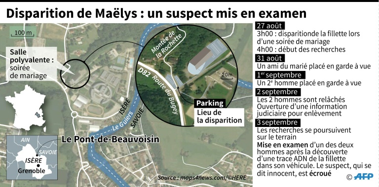 La fillette de 9 ans a disparu dans la nuit du samedi 26 au dimanche 27 août à Pont-de-Beauvoisin (Isère), vers 03H00 du matin. Avec ses parents, elle assistait à un mariage où le suspect était arrivé sur le tard. Après un ratissage de grande ampleur de la zone, les recherches sont désormais plus ciblées. Douze enquêteurs restent mobilisés 24h/24 sur ce dossier, auxquels s'associent les gendarmes territoriaux de la Compagnie de La-Tour-du-Pin. Huit plongeurs sondaient encore ce mardi de nouveaux points d'eau, a précisé une autre source proche de l'enquête.