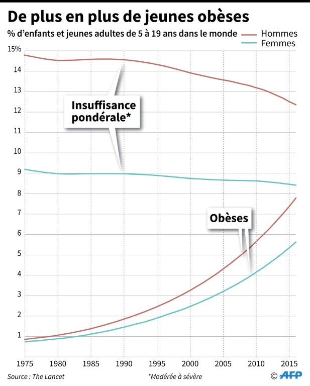 Si les tendances observées ces dernières années se poursuivent, l'obésité juvénile surpassera l'insuffisance pondérale d'ici 2022, prédisent toutefois les auteurs de cette étude, publiée dans la revue médicale britannique The Lancet. En 2016, 124 millions de jeunes de 5 à 19 ans étaient considérés comme obèses, contre seulement 11 millions en 1975, évalue l'étude, conduite par l'Imperial College de Londres et l'Organisation mondiale de la Santé (OMS).