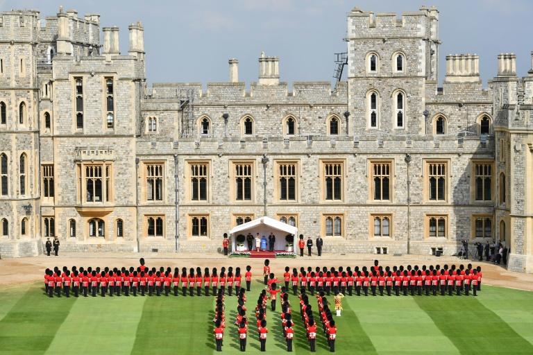 Le couple présidentiel a été accueilli par la monarque de 92 ans, toute de bleu vêtue, dans la cour du château, sous un soleil éclatant, avant d'écouter, debout, côte à côte, l'hymne national américain.