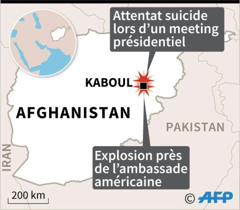 Au moins 26 personnes ont été tuées mardi en Afghanistan lors de deux attentats, l'un contre un meeting électoral du président Ashraf Ghani et l'autre à Kaboul, tous deux revendiqués par les talibans qui considèrent le scrutin présidentiel prévu le 28 septembre commme illégitime.