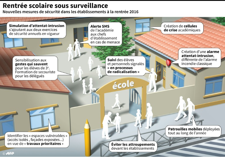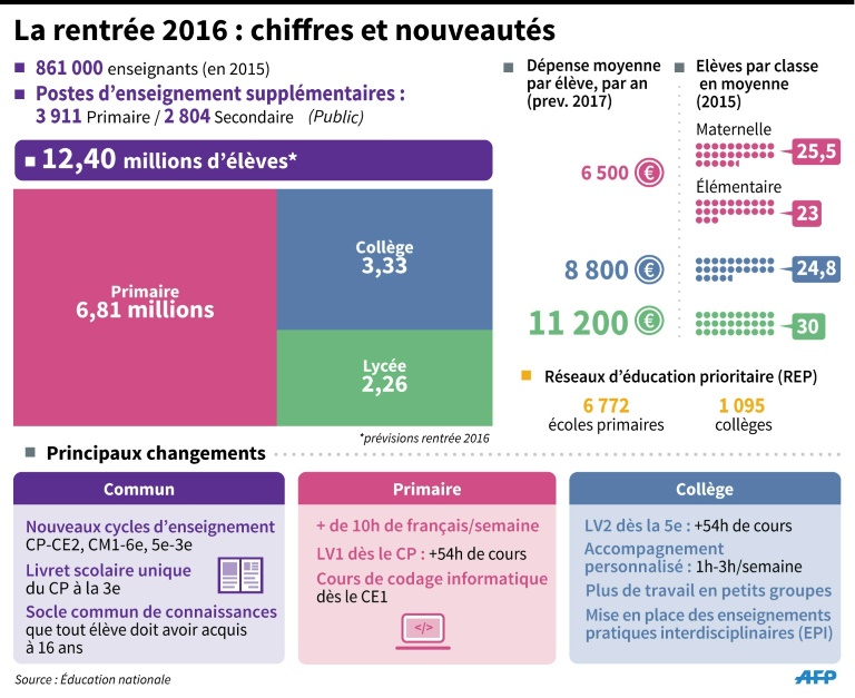 Après deux mois de vacances, 12 millions d'élèves entament jeudi une nouvelle année scolaire, marquée par de nouveaux programmes, une réorganisation controversée du collège et "une vigilance totale et extrême" face au risque d'attentats.