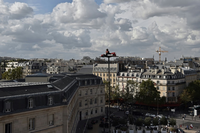 Face à l'horloge de la gare de Lyon à Paris, l'artiste français a fait le pari de vivre pendant cinq jours sur une plateforme située à 20 mètres de haut, dont il descendra samedi pour lancer la Nuit Blanche 2016.Le geste est sûr, sans appréhension. Devant les yeux intrigués de voyageurs, nez et smartphone en l'air, l'artiste de 44 ans pose un genou sur sa "vigie", une plateforme de 90 cm sur 1,60 m.