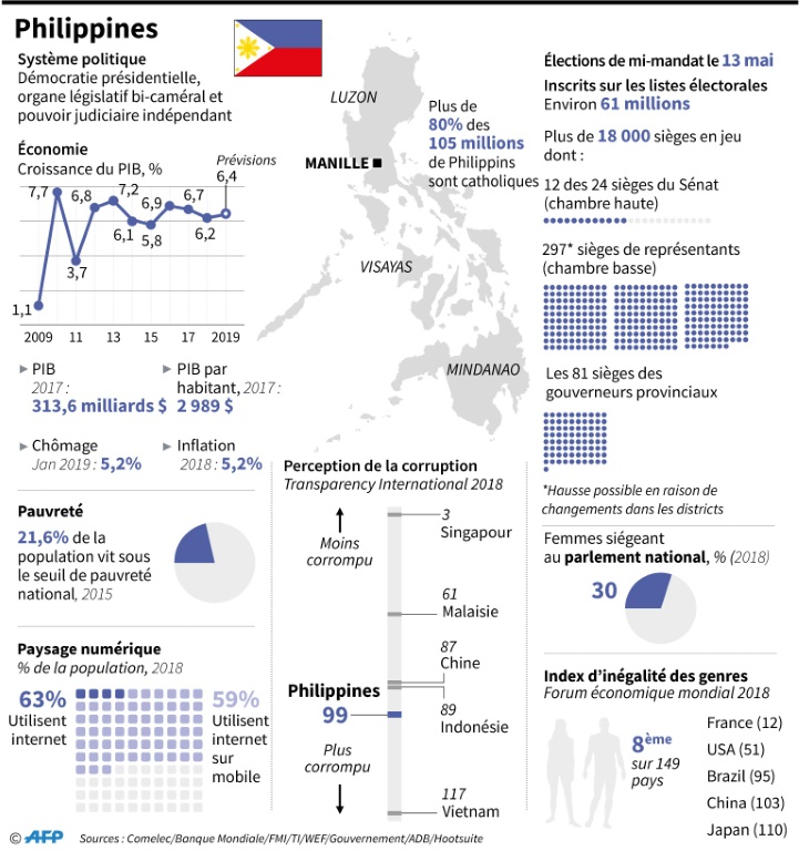 Les Philippins ont commencé lundi à voter pour des élections de mi-mandat qui devraient donner les coudées franches au président Rodrigo Duterte pour, potentiellement, mettre en oeuvre ses promesses de rétablissement de la peine de mort et de réforme de la constitution.