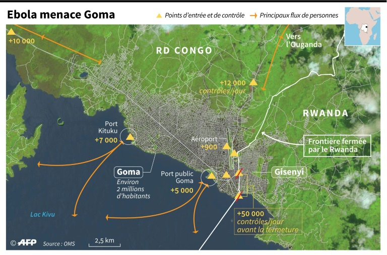 Un correspondant de l'AFP sur place a constaté que les Rwandais n'étaient pas autorisés à se rendre à Goma, une ville d'un à deux millions d'habitants. Les Congolais sont, eux, autorisés de traverser la frontière. En revanche, il leur est interdit de retourner au Rwanda, même ceux qui vivent à Gisenyi. Goma forme un hub régional, disposant d'un aéroport reliant les capitales de Kinshasa en RDC, Entebbe-Kampala en Ouganda et Addis Abeba en Ehtiopie. Des bateaux en partent aussi vers la province congolaise du Sud-Kivu. En juin, deux cas d'Ebola en provenance de la RDC avaient détectés sur le territoire ougandais.