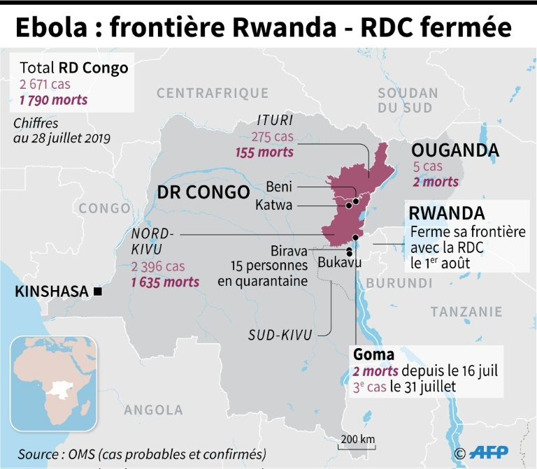 Le Rwanda a fermé sa frontière avec la RDC jeudi, au lendemain de la mort d'une deuxième victime de l'épidémie d'Ebola à Goma et la détection d'un troisième cas dans ce grand carrefour commercial frontalier, des développements accroissant les risques de propagation de la maladie dans la région.
