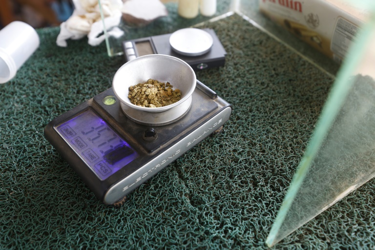 Les 35 "grammes" affichés sur la balance équivalent à environ 3.000 dollars, explique le commerçant. Un gramme se vend entre 85 et 100 dollars.