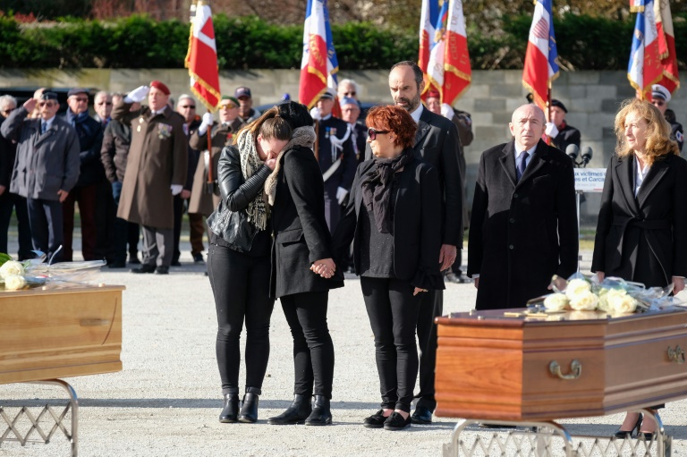 Au lendemain de l'hommage national rendu au colonel Arnaud Beltrame, qui a donné sa vie pour sauver une otage, les proches de Jean Mazières, 61 ans, de Christian Medves, 50 ans, et de Hervé Sosna, 65 ans, ont déposé des roses blanches sur les trois cercueils, avec les autorités, avant que ne résonne la Marseillaise.