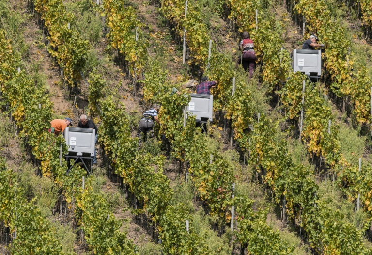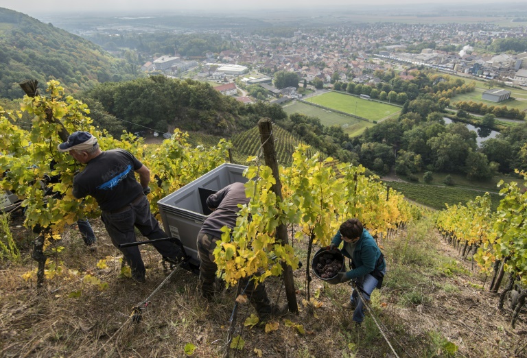 "Le cadre, c'est la cerise sur le gâteau. On se bat pour venir", déclare François Siffer, depuis une rangée voisine où une "schlitte" - traîneau alsacien servant de hotte - est retenue par une corde. La "schlitte", guidée par les cueilleurs les plus costauds, est bientôt remplie des premières grappes, transférées entre les rangs escarpées grâce aux seaux.
