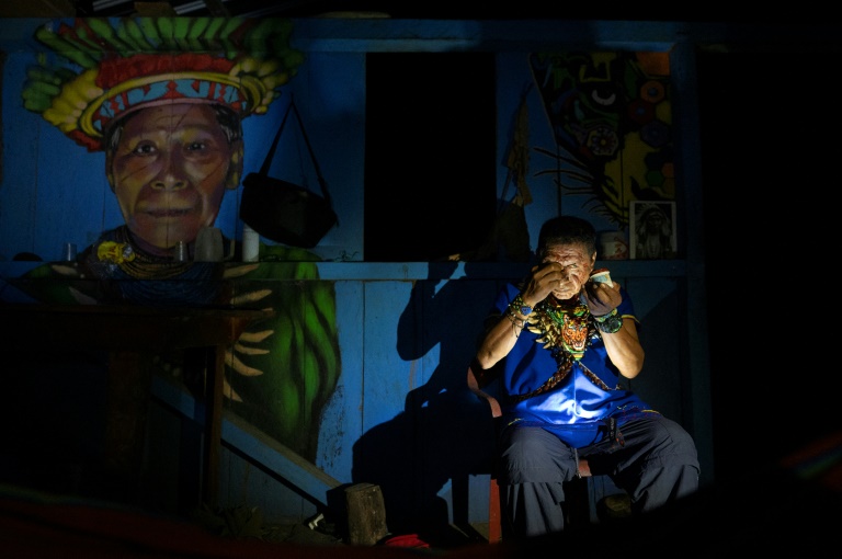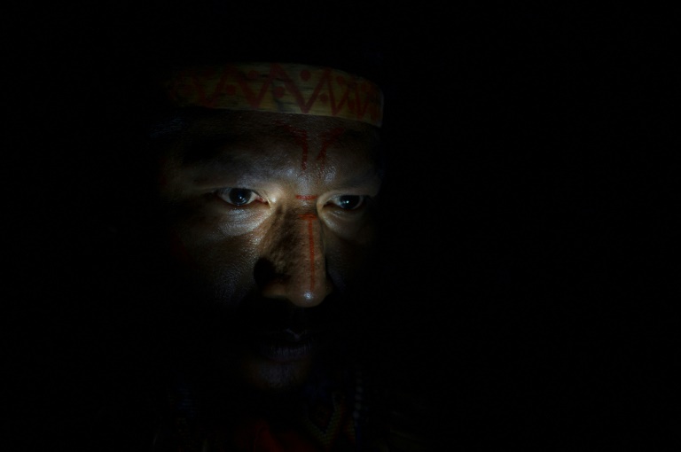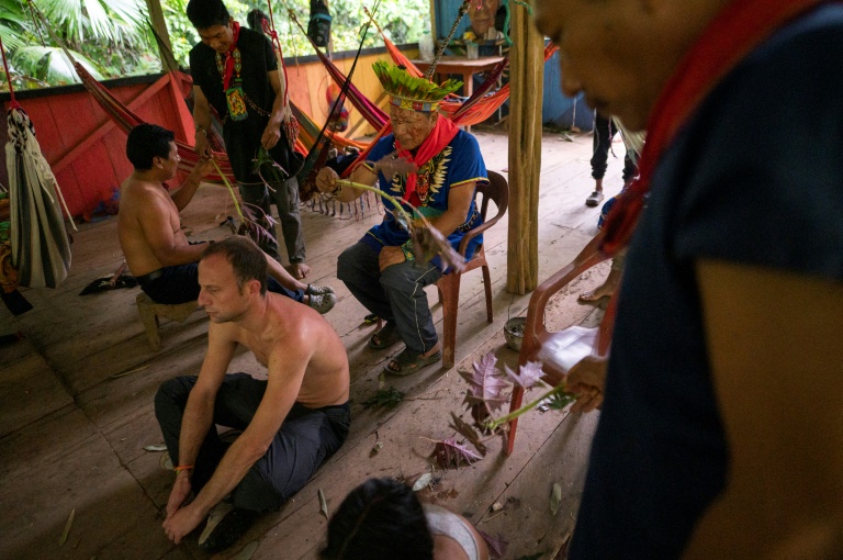 Collier de dents de pécaris sur la poitrine, foulard rouge autour du cou et plume en travers du nez, ce "héros de la biodiversité", comme le désignent certaines ONGs, officie ce soir au côté de son père comme assistant et chanteur à la guitare pour accompagner le voyage et la transe des participants.