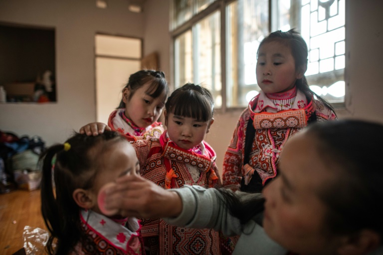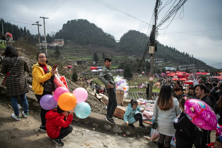 Autour d'un pré verdoyant du village de Longjia, dans la province du Guizhou, des curieux vêtus de parkas s'agglutinent sur les pentes des alentours, smartphones en main, pour assister à la Fête des fleurs ("Tiaohuajie"). Des dizaines de femmes et de fillettes vêtues de robes colorées dansent et jouent du tambourin à l'occasion de cette célébration organisée tous les ans pour le dixième jour de l'année lunaire -- l'Année du Cochon a débuté le 5 février.