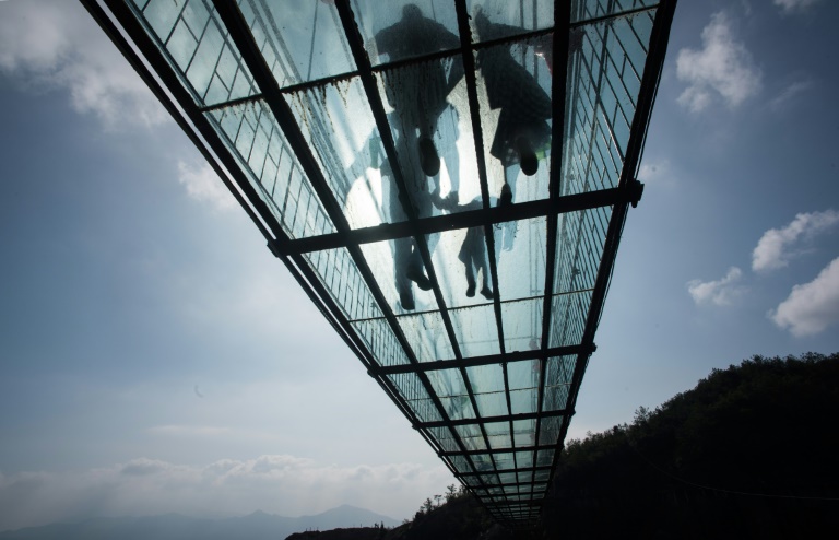 Sous leurs pas, le pont, retenu par des filins d'acier, balance et les photos envoyées sur le net montrent des touristes terrorisés à genoux sur la surface transparente, incapables d'avancer, paralysés par la peur.