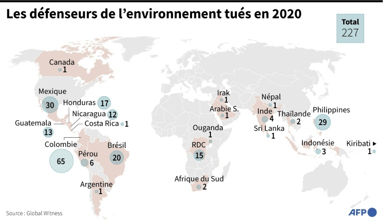 En pleine interview tĂ©lĂ©phonique avec l'AFP, l'incident est Ă peine notable pour Mme Umenza, installĂ©e dans son petit bureau de la municipalitĂ© de ToribĂo, dans le dĂ©partement de Cauca (sud-ouest de la Colombie). Au moins 227 militants Ă©cologistes ont Ă©tĂ© tuĂ©s dans le monde en 2020: près d'un tiers d'entre eux (65) l'ont Ă©tĂ© en Colombie, a rĂ©vĂ©lĂ© l'ONG Global Witness dans son rapport annuel publiĂ© lundi.