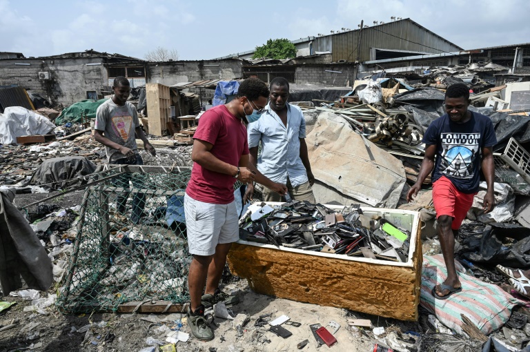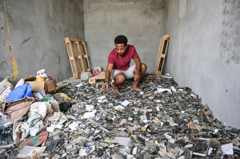 Artiste "écolo et engagé", l'Ivoirien Désiré Mounou Koffi donne une seconde vie à de vieux téléphones portables au rebut en les recyclant dans des peintures colorées. (Photo : AFP)