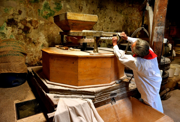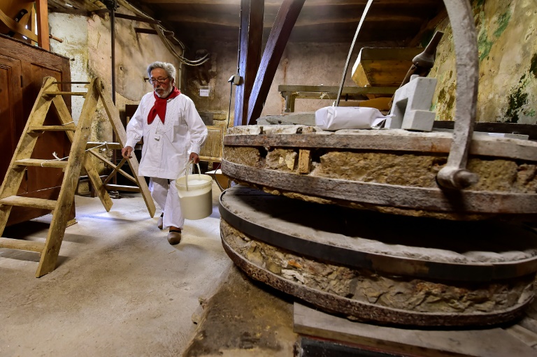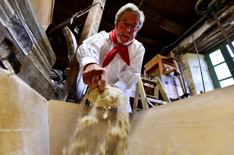 Vêtu comme un meunier d'antan, Elie Coustaty surveille de près la meule qui tourne lentement pour moudre l'or blanc du confinement: le coronavirus a dopé l'activité de son moulin à eau du XIVe siècle, situé sous sa maison en Dordogne.