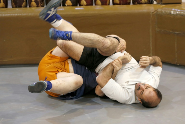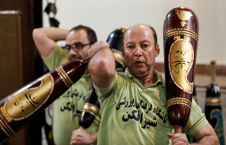 Devant lui, des adeptes de ce que l'on appelle en Iran l'"ancien sport", ou le "sport héroïque", s'entraînent dans une fosse octogonale. Ils utilisent le même équipement depuis des siècles: de grandes quilles de bois ("mil") semblables à des massues, une sorte d'arc en métal, et un large et lourd bouclier ("sang").