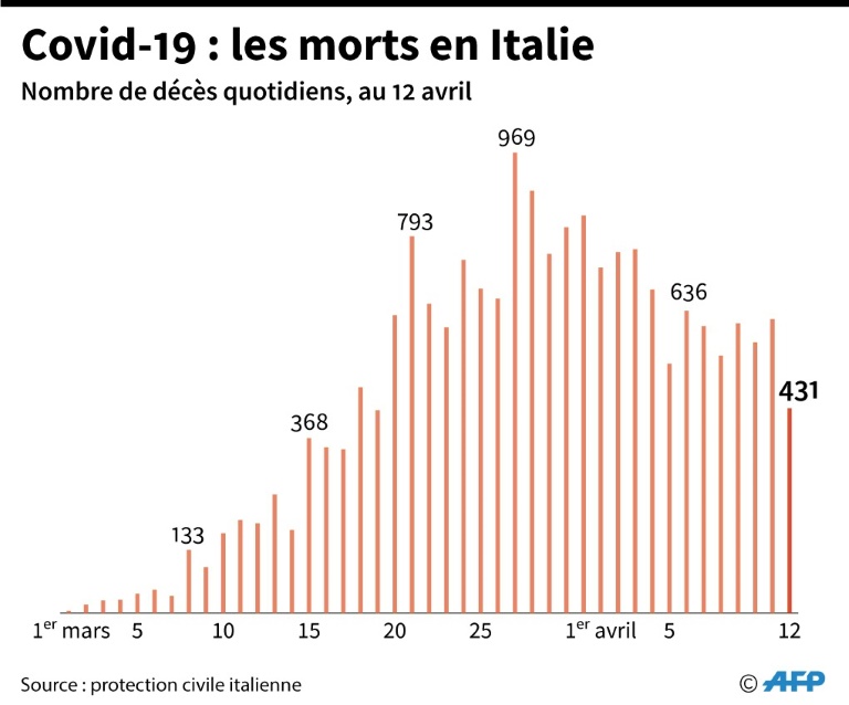Pour le dimanche de Pâques, l'Italie a annoncé sa journée la moins meurtrière depuis plus de trois semaines, avec 431 décès de la maladie Covid-19 dans les dernières 24 heures.