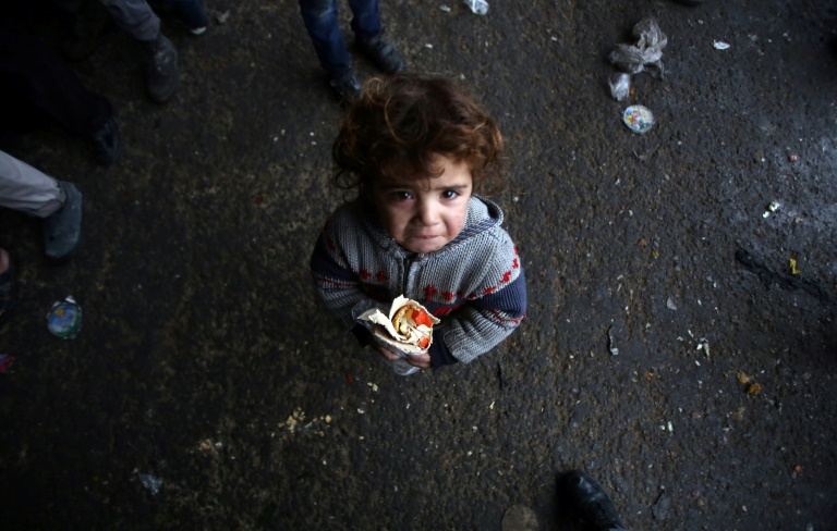 Il enlève son manteau noir et le pose sur les frêles épaules de sa fille, trempée jusqu'aux os après avoir dû marcher sous une pluie battante du quartier rebelle de Karam al-Mayssar vers une zone gouvernementale d'Alep.