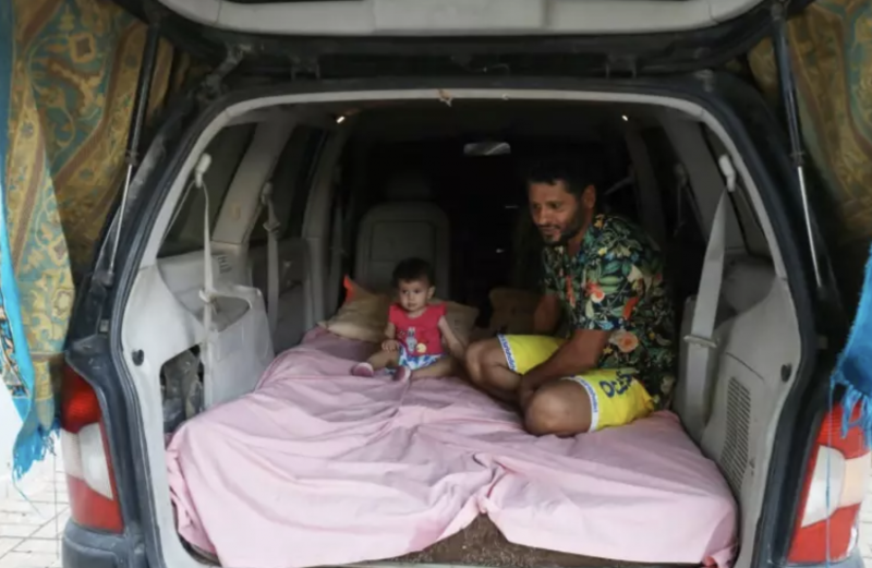 "J'ai retiré les sièges arrières et j'ai transformé le coffre en chambre à coucher pour la climatisation. On dort ici quand il fait chaud", raconte ce père de deux enfants installé à Tripoli. La "pièce" aménagée dans son grand monospace fait 3 m2.