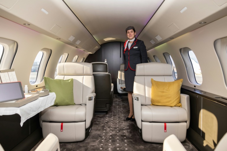 Fauteuils en cuir couleur crème, lit moelleux, dégustation de vin... La compagnie soigne les détails à bord de ce luxueux appareil, prévoyant même un kit de voyage pour les animaux de compagnie, comprenant jouets et croquettes.
