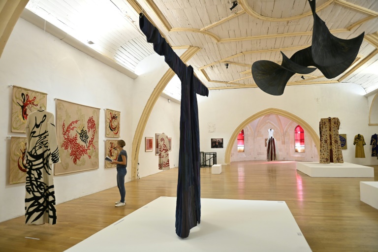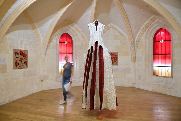 Sous les arches de la salle d'exposition du Méjan, au coeur d'Arles, ville connue pour son patrimoine romain et médiéval, des manteaux brodés en laine ou taffetas - l'un nommé "Envol de la paix" - habitent l'espace et une majestueuse robe en soie, "Eternel", rend hommage "à la femme afghane brimée", entre deux bouquets de tulipes brodées.