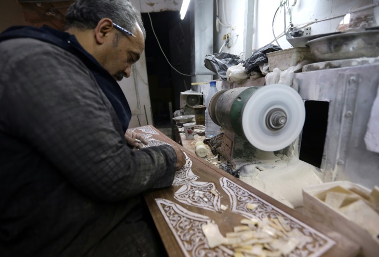 Dans un petit local à Damas, Mohamed Abdallah parfait délicatement un cadre en bois avant de l'incruster de nacre: la guerre l'a obligé à abandonner son atelier de marqueterie et comme des milliers d'artisans syriens, il juge son métier menacé.