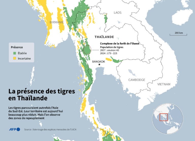 La Thaïlande espère restaurer sa population de tigres d'Indochine, au bord de l'extinction dans les années 2000, mais qui, grâce aux efforts des autorités et des défenseurs de l'environnement, remontre le bout de son museau, dans des proportions jamais vues en Asie du Sud-Est.