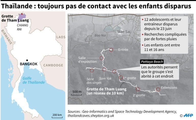 Depuis la base opérationnelle installée dimanche au coeur de ce réseau de dix kilomètres de long, "la distance jusqu'à Pattaya Beach est de moins de 600 mètres", a expliqué un responsable de la marine à l'AFP. L'espoir était donc de mise lundi, que ce soit dans les directs télévisés ou dans la cour de l'école de Mae Sai Prasitsart, dans le nord de la Thaïlande, où sont scolarisés six des douze enfants. Une cérémonie y a été organisée lundi, dans l'espoir de "bonnes nouvelles" à venir.