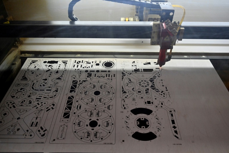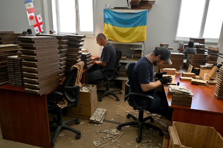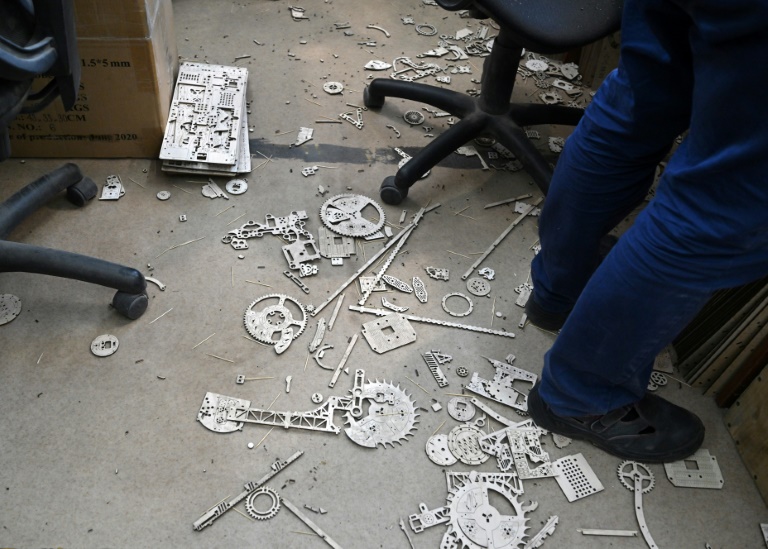 Copeaux jonchant le sol et bonne odeur de bois: après plus de trois mois d'arrêt forcé, l'activité a repris grâce à des dons dans une usine bombardée du nord de Kiev qui fabrique des puzzles 3D en bois.