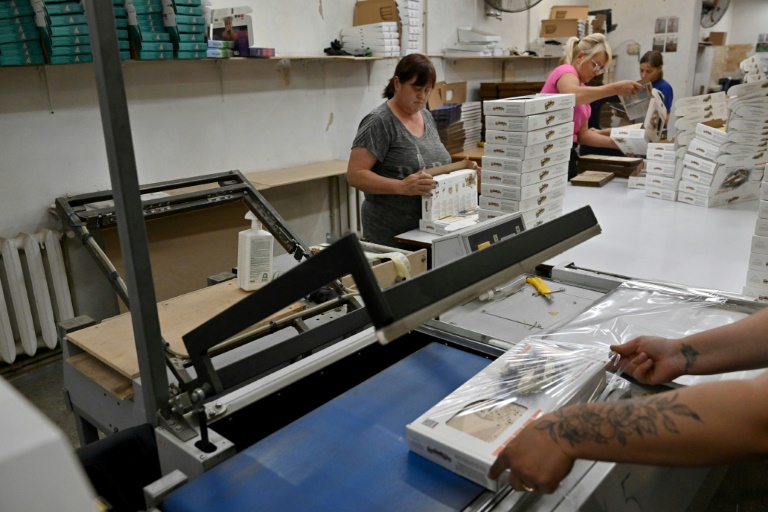 Flottant sur les toits, affiché sur les murs, le drapeau national est omniprésent et Iryna Denyssiouk, 33 ans, responsable de la chaîne d'emballage, se dit "très fière de participer à cette production ukrainienne en temps de guerre".